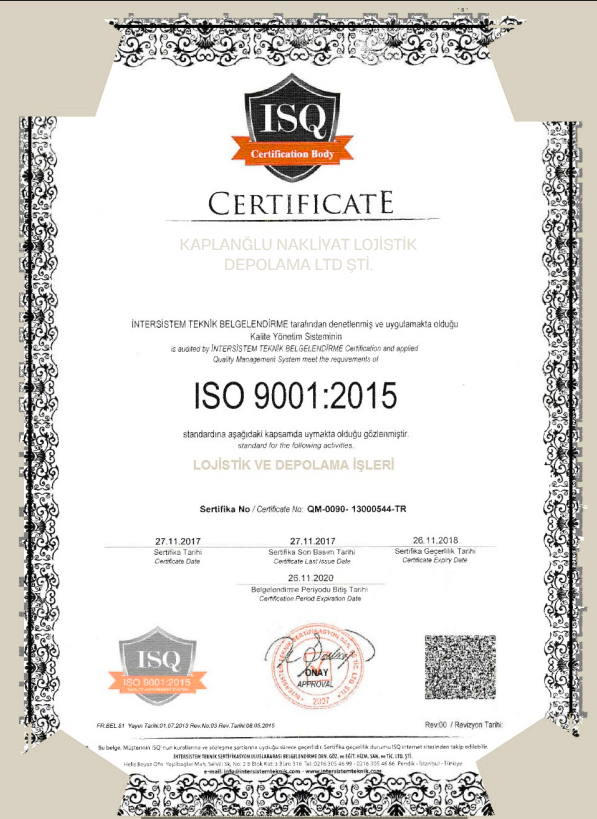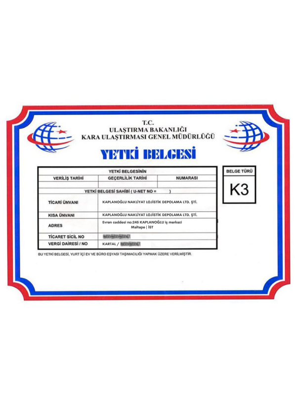 Kaplanoğlu Nakliyat olarak, sunduğumuz tüm hizmetlerde yüksek kaliteyi garanti etmek için sektördeki en önemli belgeleri alarak, müşteri memnuniyetini en üst seviyeye çıkarmak adına her zaman en iyiye ulaşmayı hedefliyoruz. Bu hedef doğrultusunda, taşımacılık sektöründeki yetkinliğimizi ve güvenilirliğimizi kanıtlayan önemli belgelerimiz arasında K3 Yetki Belgesi ve ISO 9001 Kalite Yönetim Sistemi Belgesi yer almaktadır.
